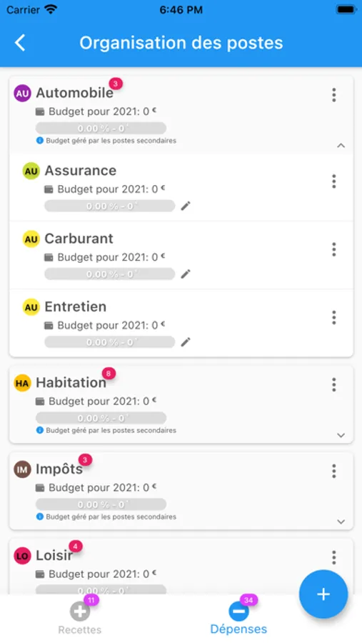 - Organiser les postes de recettes et de dépenses sur 2 niveaux