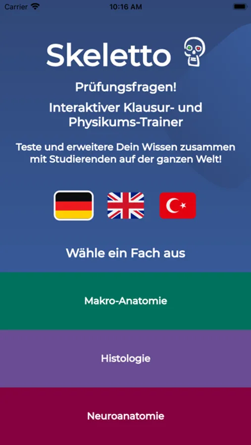Skeletto is quiz-based interactive human anatomy learning app with thousands of exam questions. The app is an exam trainer. It covers the entire macroscopic gross anatomy, neuroanatomy and histology. Skeletto is not only suitable for human and dental medicine, but for everyone who needs anatomy in their studies (human biology, biomedical sciences, physiotherapy, nutritional sciences, neurosciences, etc.). If you solve the questions in this quiz game well, you don't have to be afraid of the upcoming exams.