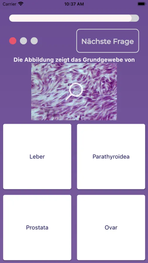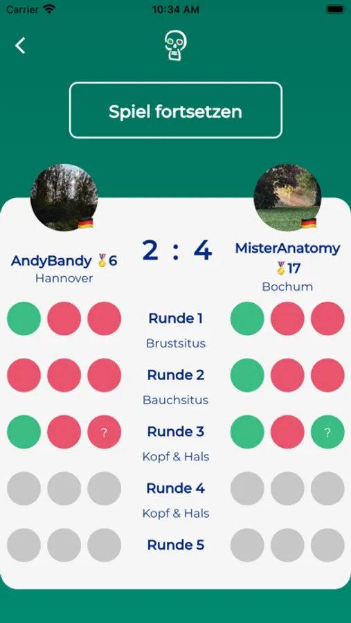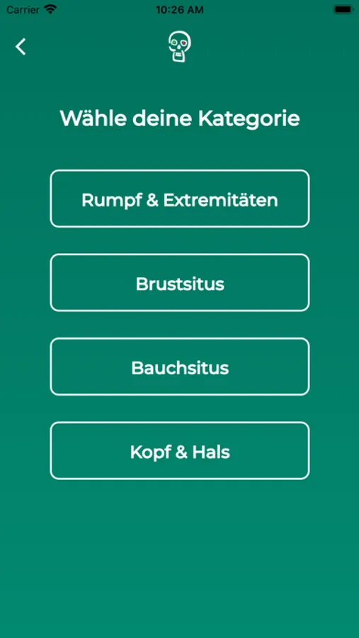 After installation, the user can now test his anatomical knowledge in the categories "Macroscopic Anatomy, Neuroanatomy and Histology" in interaction with other participants from all over the world who are selected by him or determined by the app through a random generator. In each subject, subcategories can be selected, such as in Gross anatomy "Trunk & Limbs", "Thoracic situs", "Abdominal situs" and "Head & Neck". In Neuroanatomy, the subcategories are "Central Nervous System," "Peripheral Nervous System," "Functional Systems," and "Sensory Organs," and in Histology, the subcategories are "Cytology," "Basic histology and tissues", "Organ Histology," and "Sense Organs." All these subcategories contain simple to very challenging questions with additional picture questions.