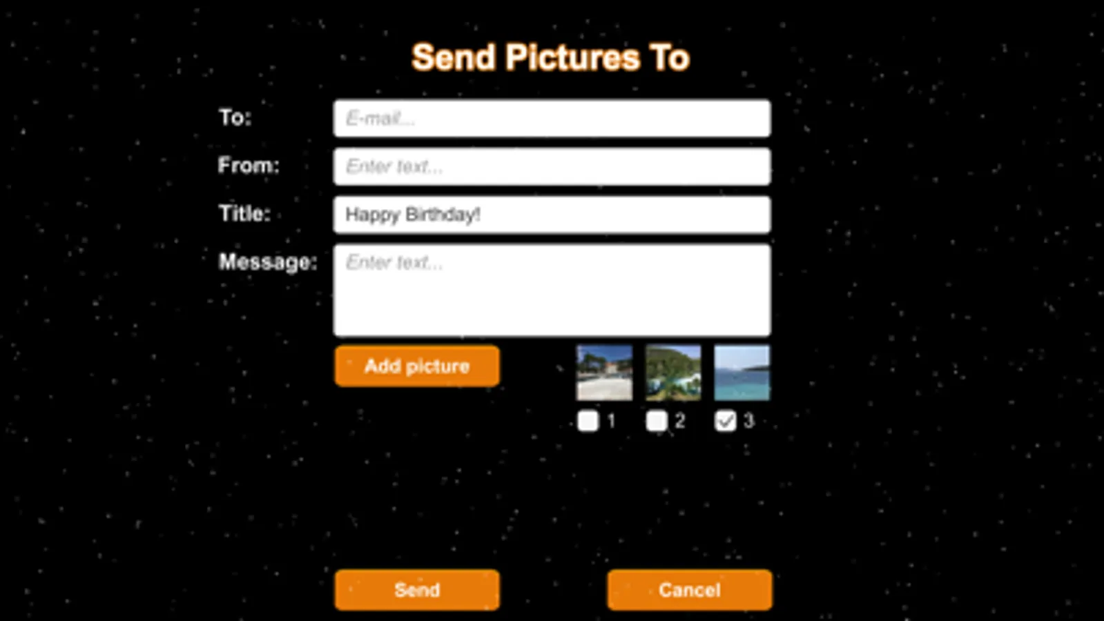 Upload up to 3 pictures for free from your photo library and send them as a gift to your friends and family.