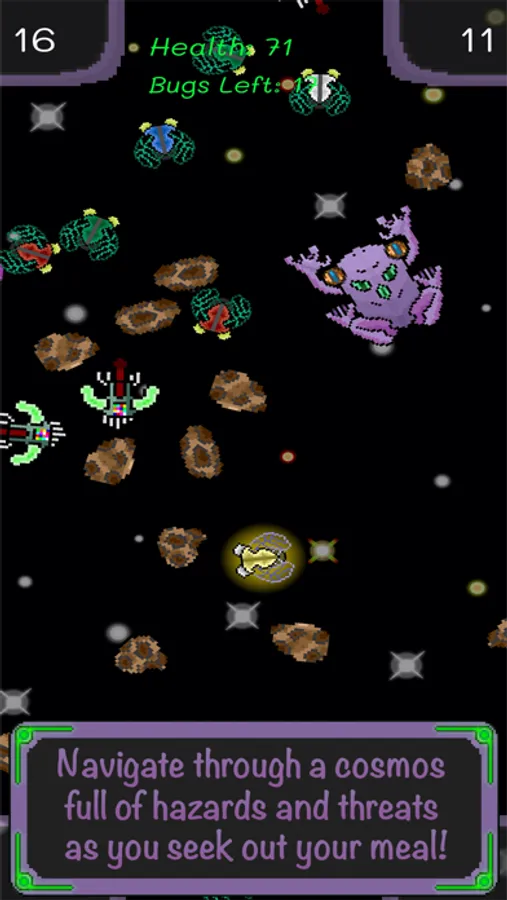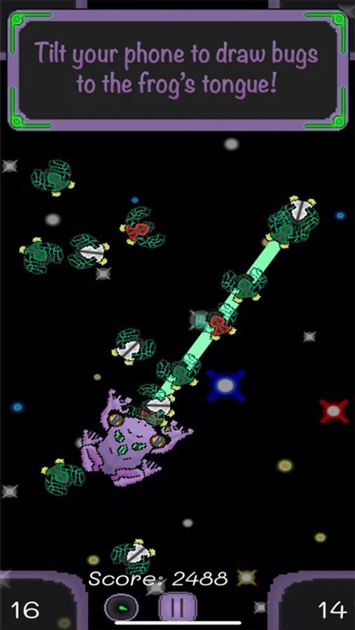 Play as a giant space frog who is endlessly hungry. Controlling bizarre gravity powers to draw in its prey, assist the frog in satisfying its hunger in a never-ending struggle for survival. Tilt your device to manipulate gravity and guide space bugs into range, then slurp them up with a very long tongue, all the while making sure to avoid consuming any of the hazardous objects that are also drawn to the frog.