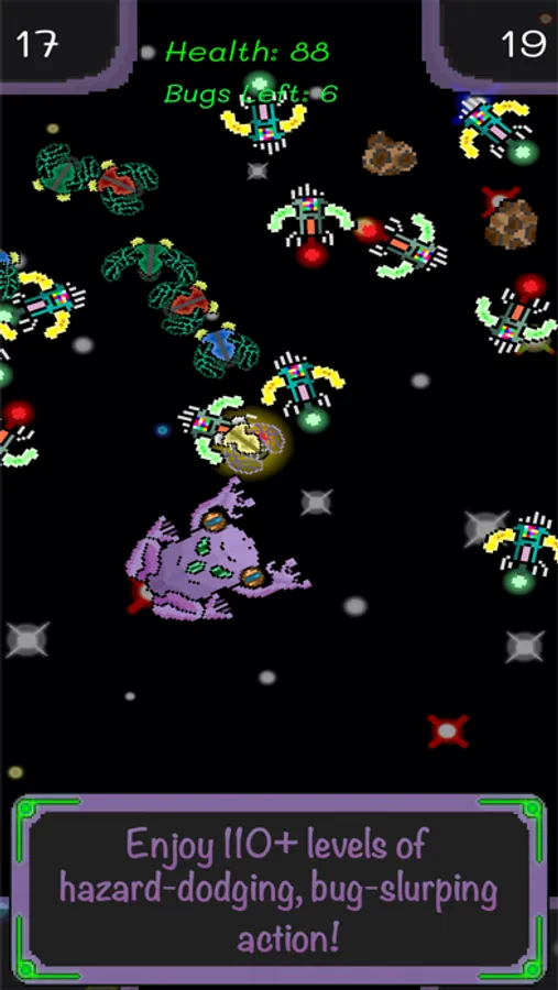 -110+ levels of bug-slurping, hazard-dodging action!