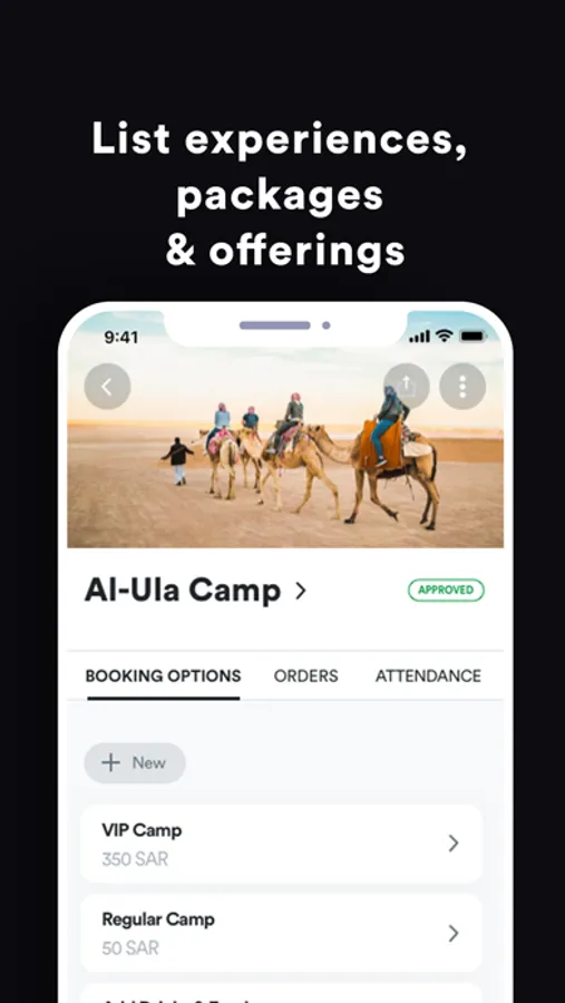 With the Saudi Expert app, you can manage your business and tourism experiences right from your pocket. Create experiences & offerings for your customers, manage pricing & booking options, get more sales, and communicate directly with your customers. All these benefits and more are being added to help your business grow and develop the Saudi tourism industry.