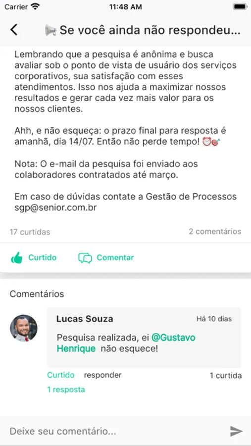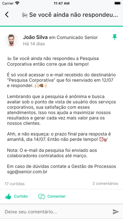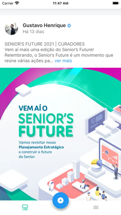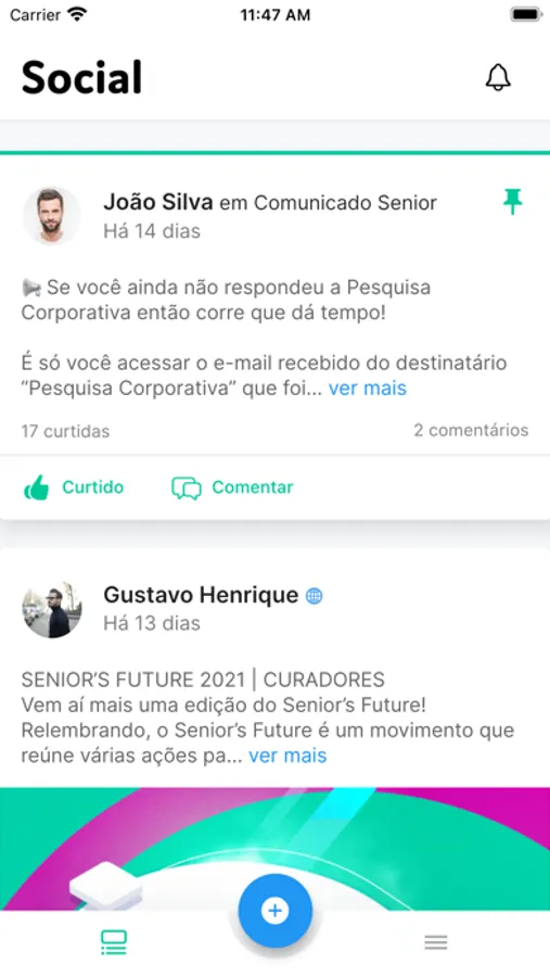 Acompanhe os comunicados, curta e comente as novidades de sua empresa que utiliza a Rede Social Corporativa da Plataforma Senior X.