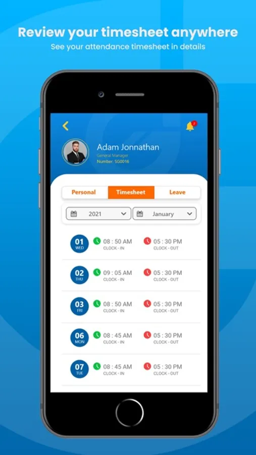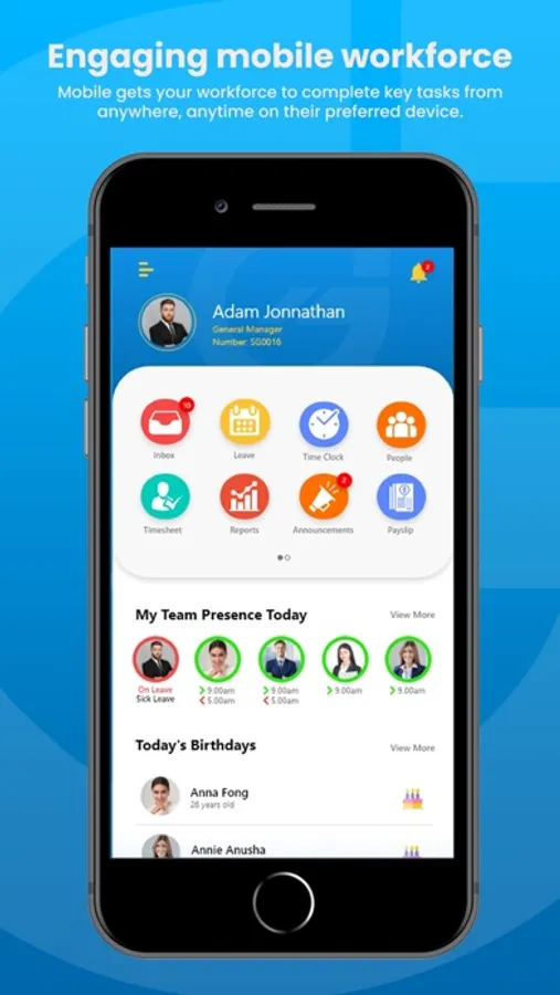 • Review your team, view or request leave, check in and out for work, view your timesheet, and leave balance and history.