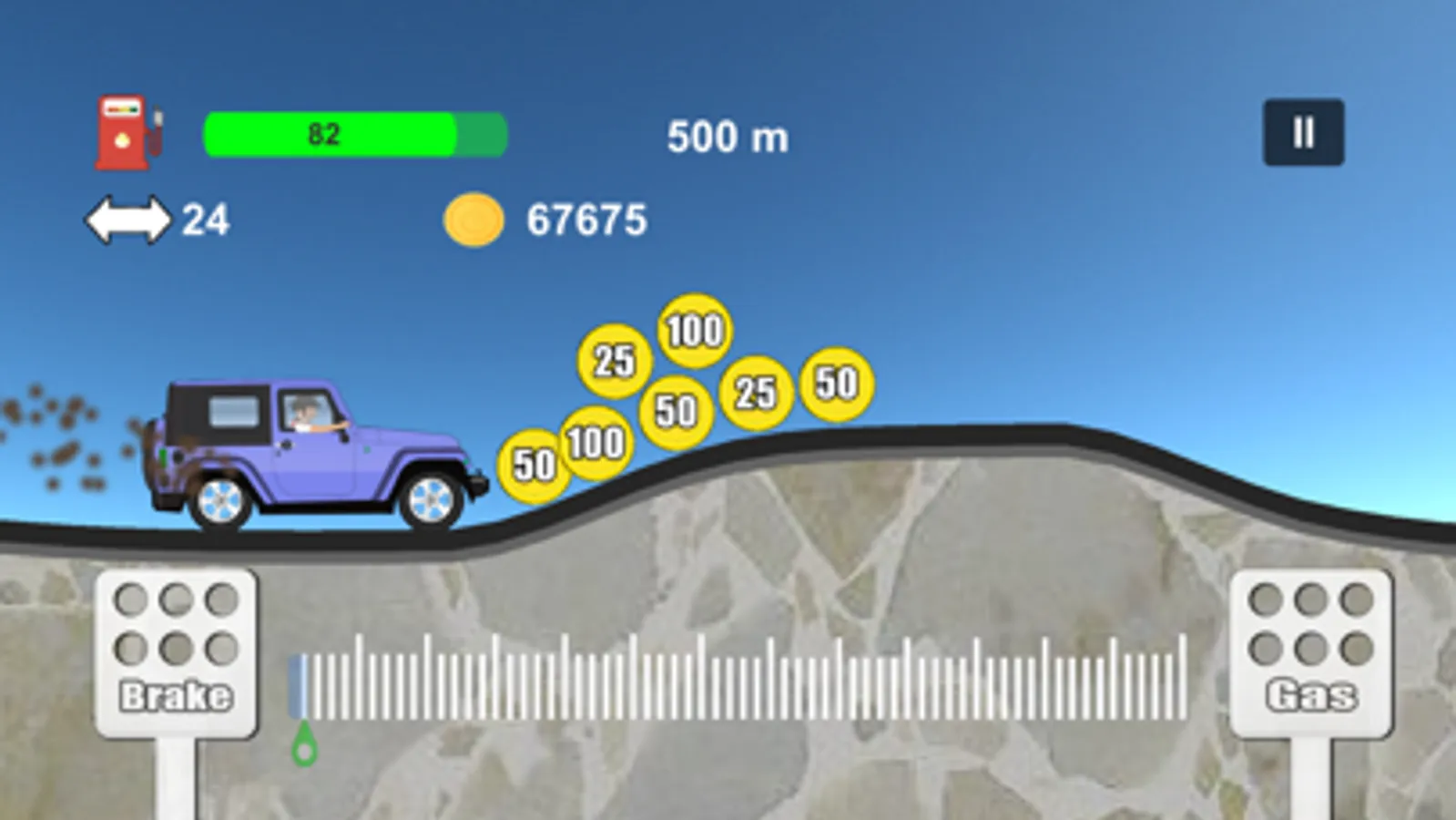 The driving operation is very simple: the car drives from the starting point on the left side of the screen to the end point on the right side, there will be a lot of gold coins and fuel cards on the road, pay attention to collect these useful props, gold coins can help us unlock more racing cars and levels, and fuel cards can restore the consumed Time, help players to pass the game smoothly, the button on the right is the accelerator, the button on the left is the brake, please control the speed well, avoid overturning, this game can exercise the brain's reaction ability, coordination ability, memory ability, This is a puzzle and relaxing game.