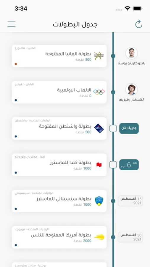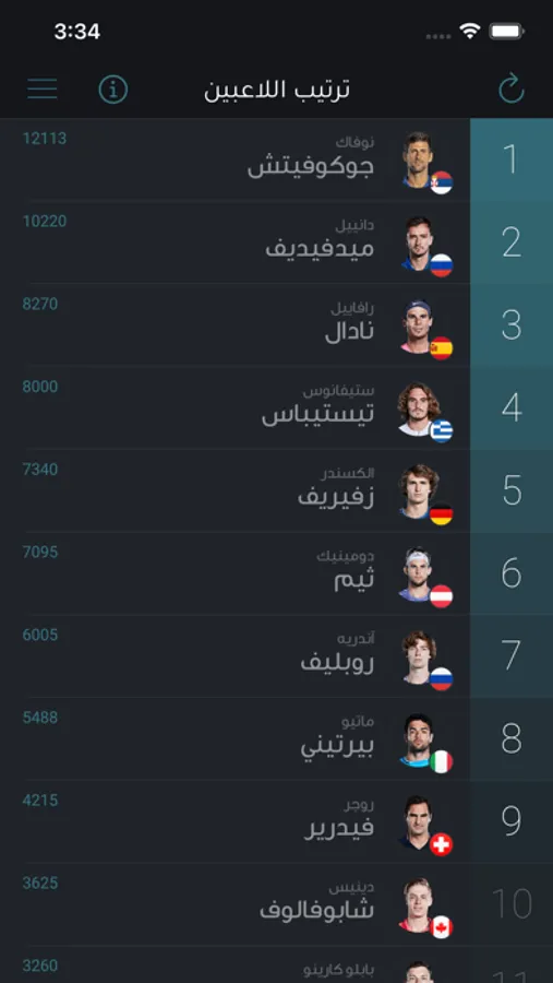 - تحديث تصنيف اللاعبين فور اعلانه من قبل رابطة محترفي التنس، كل يوم اثنين.