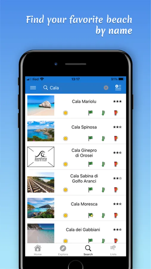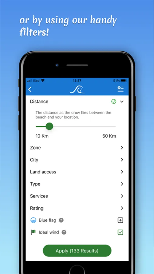 The search and filtering functions help you choose the beach to visit based on your location, the current weather conditions, the available services, and much more!