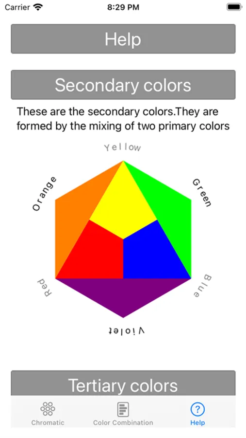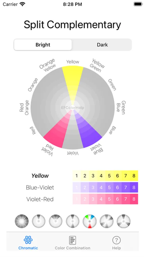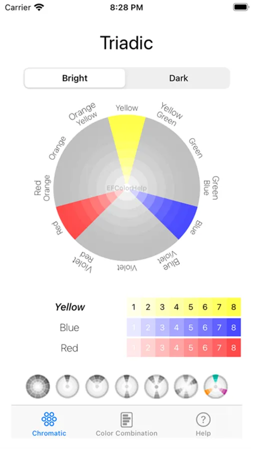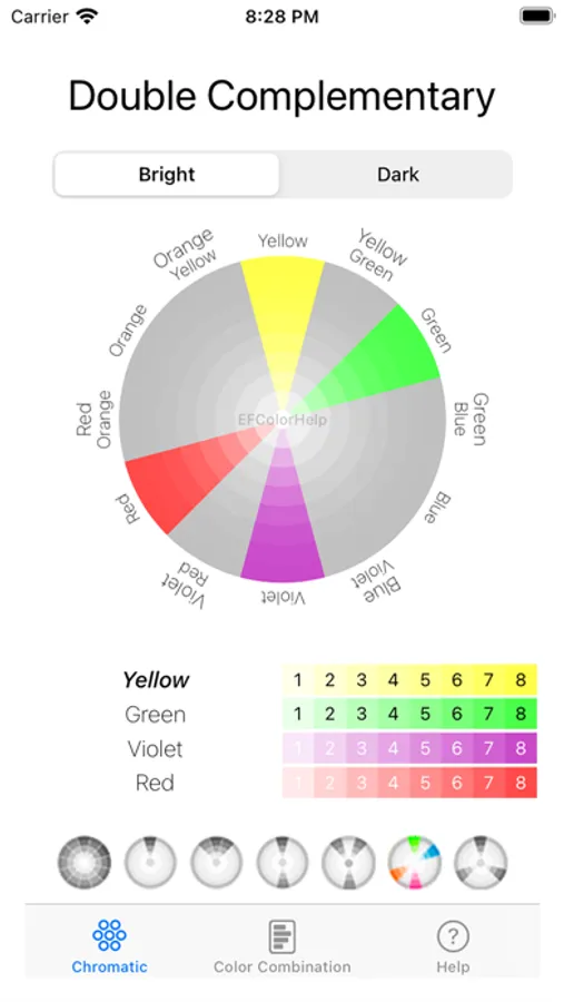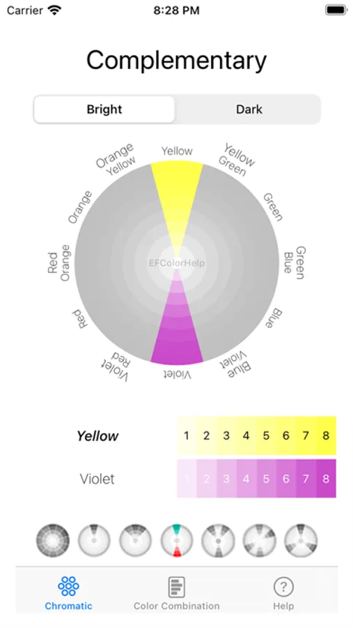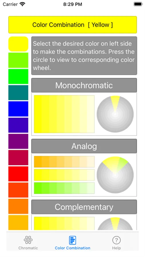 - Screen for viewing color combinations on the same page, with color selection and instant visualization of the combination applied to all circles, in addition to allowing you to select a specific circle to analyze it in detail.