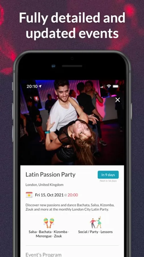 • Locate popular dancing events happening near you or upcoming ones in different cities on any date.