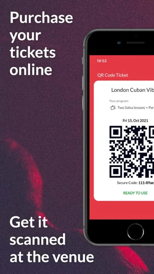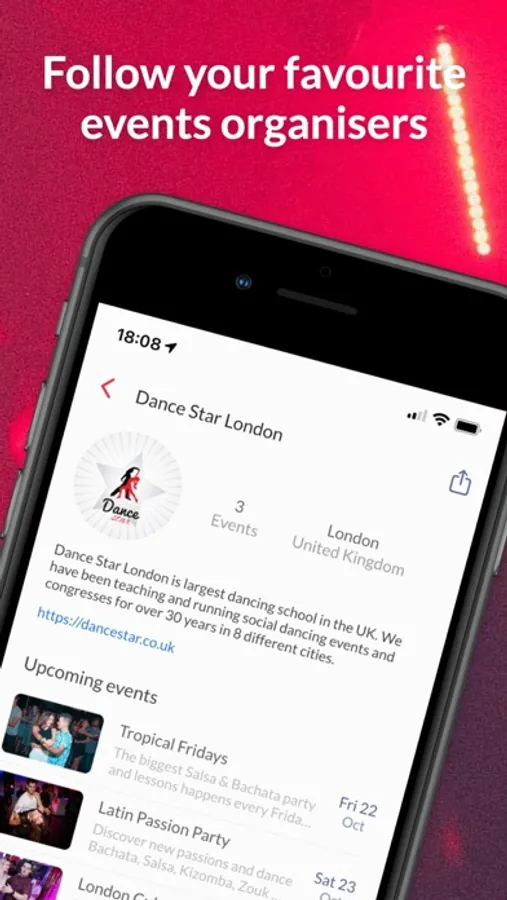 Dancing events organisers publish their weekly or monthly events, providing fully updated information to increase their exposure to users. Optionally, they can create tickets to be purchased through the app. Users can share the events and purchase their tickets online.