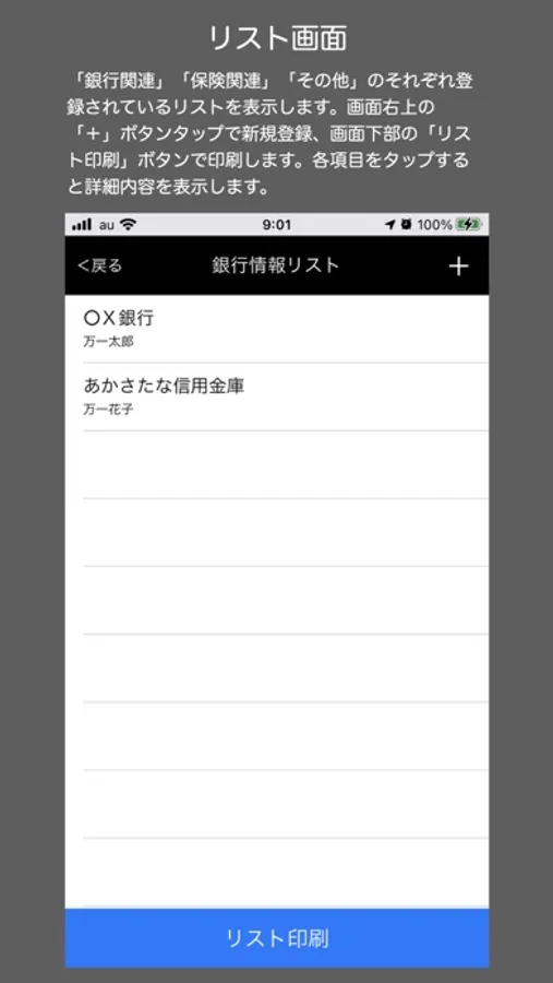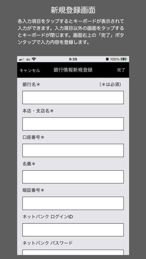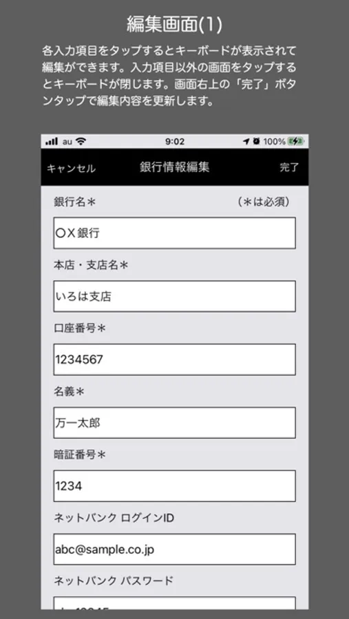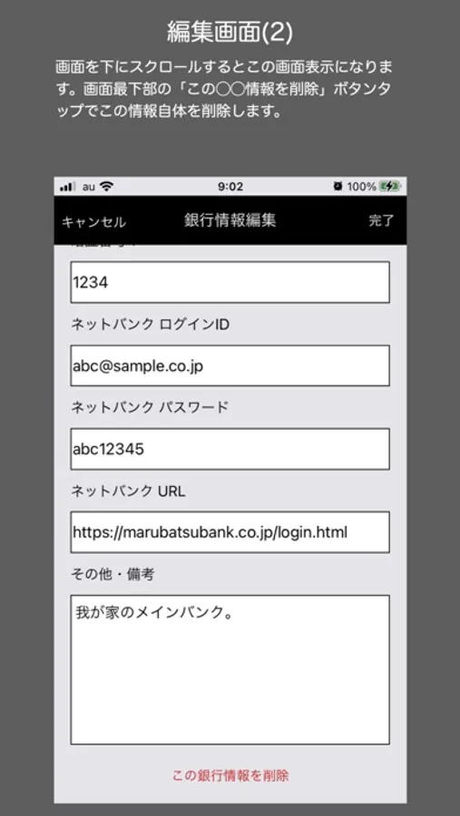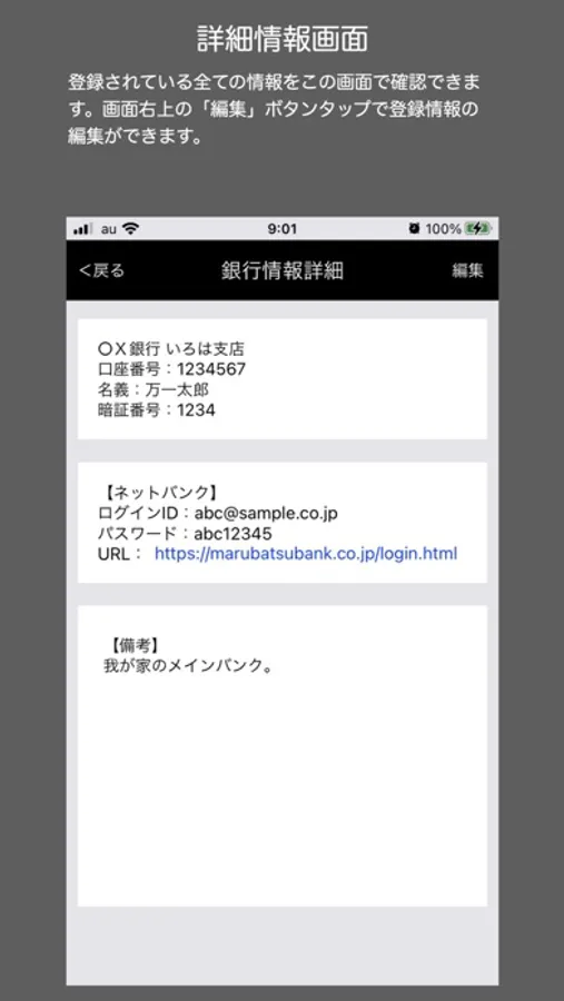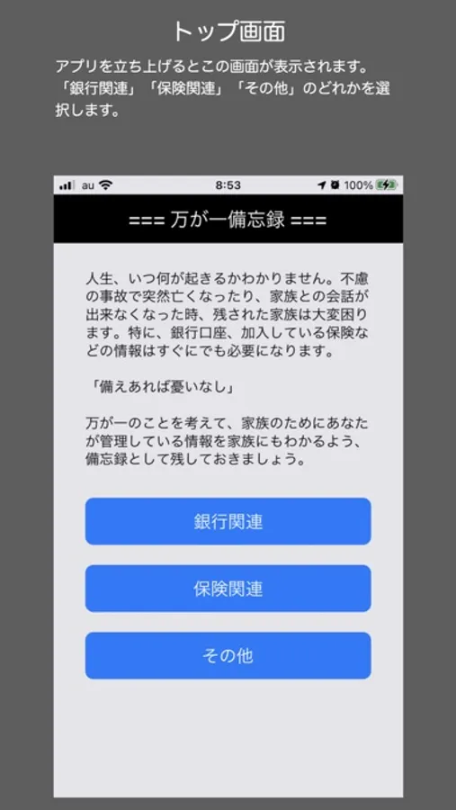 本アプリでは、「銀行関連」「保険関連」「その他」の3つのカテゴリーで分類しています。それぞれのカテゴリーで登録できる情報は以下の項目になります。