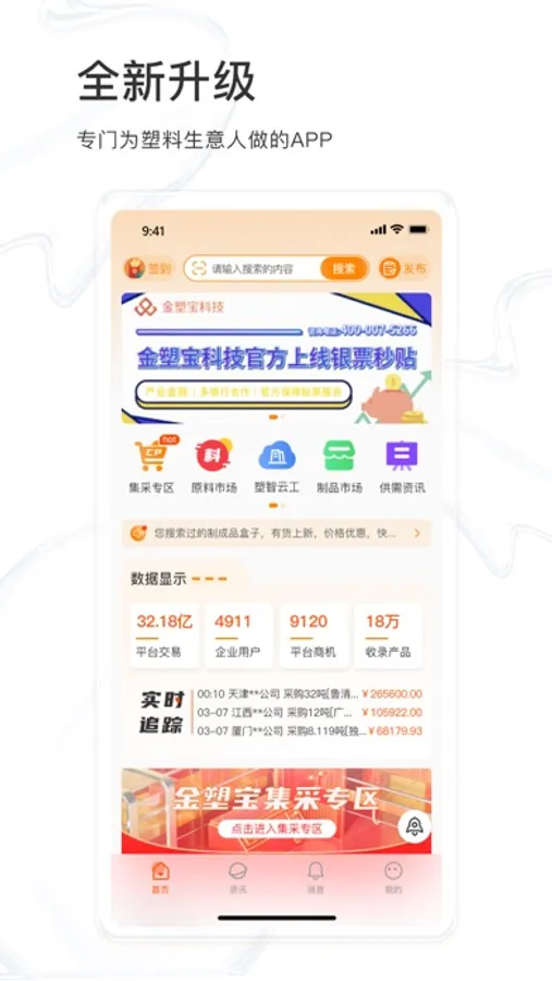 金塑宝app塑化产品交易软件,提供了“原料发布、求购、采购直达、最低报价查看、行情动态”等掌握最新动态,帮助企业降本增效。