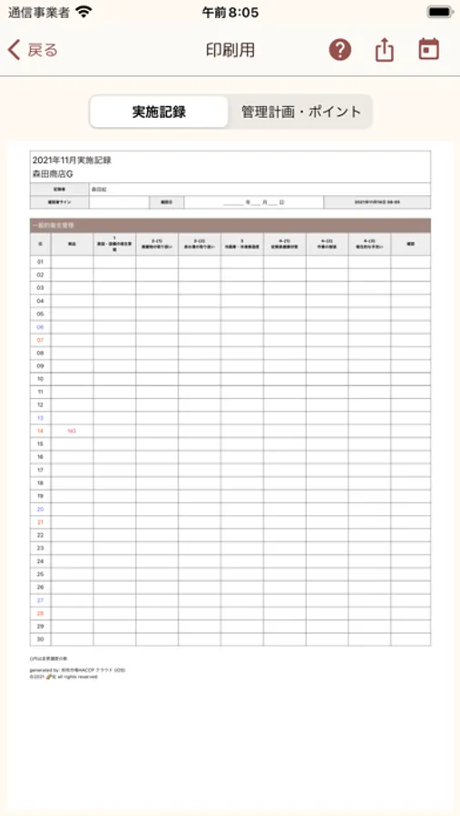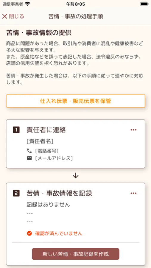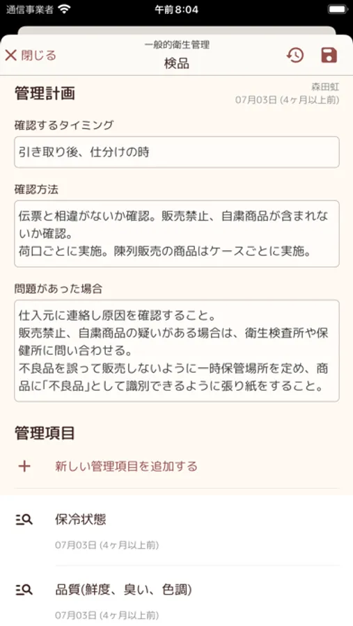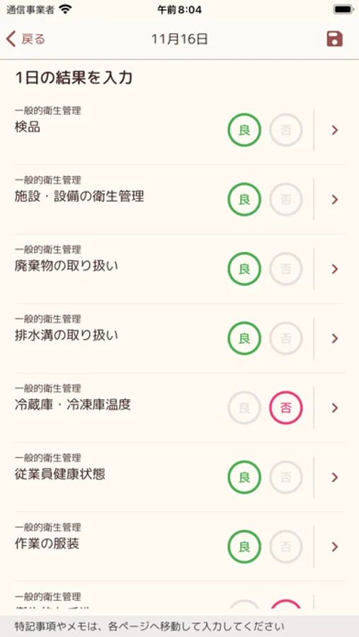 施設・設備の状態、冷蔵庫・冷凍庫の温度、従業員の健康状態