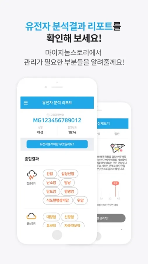 • 유전자분석결과: 유전자 분석 결과 리포트를 확인 할 수 있습니다.