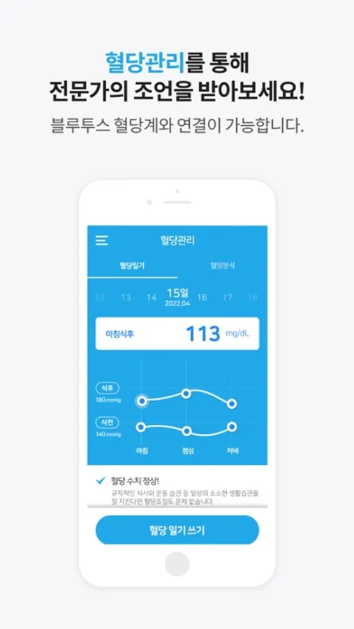 • 혈당관리: 직접 또는 블루투스 혈당계를 통해 혈당일기를 작성하고 관리할 수 있습니다.