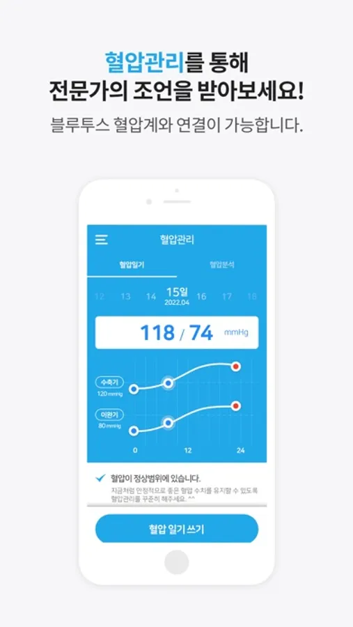 • 혈압관리: 직접 또는 블루투스 혈압계를 통해 혈압일기를 작성하고 관리할 수 있습니다.