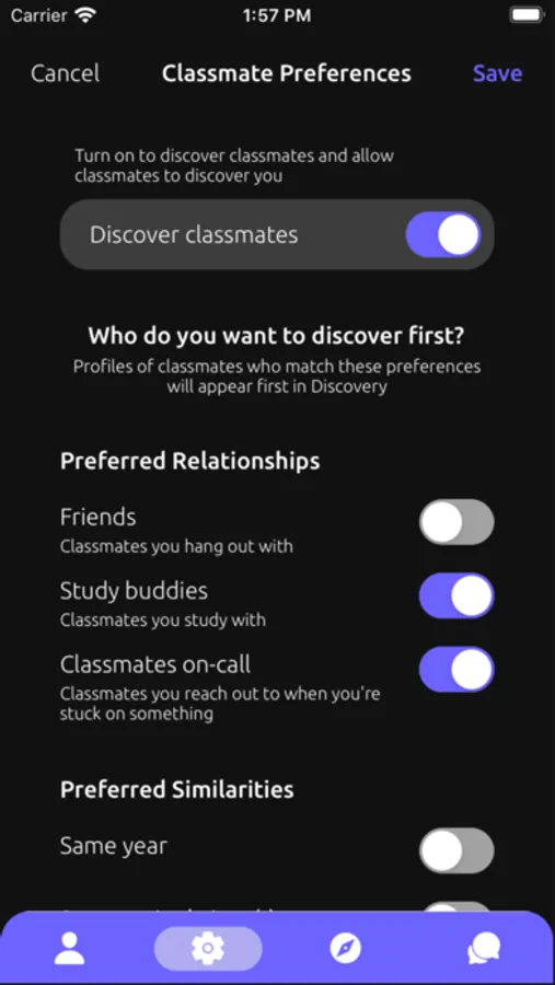 1. Choose which attributes (year, major, availability, interests, etc.) you prefer to have in common with classmates to discover your most compatible classmates first.