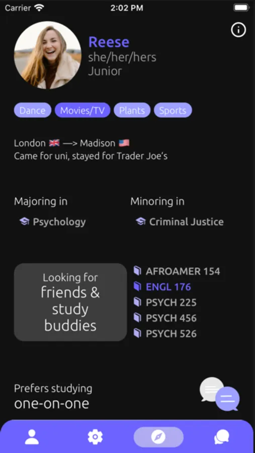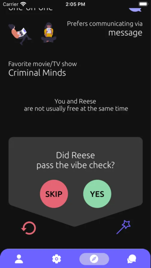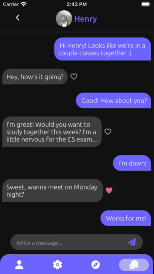 3. You’ll be matched with a classmate if you both pass each other's vibe check. Message your matches with confidence knowing there is mutual interest :)