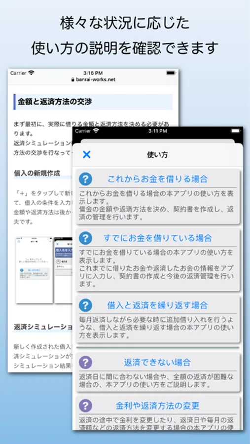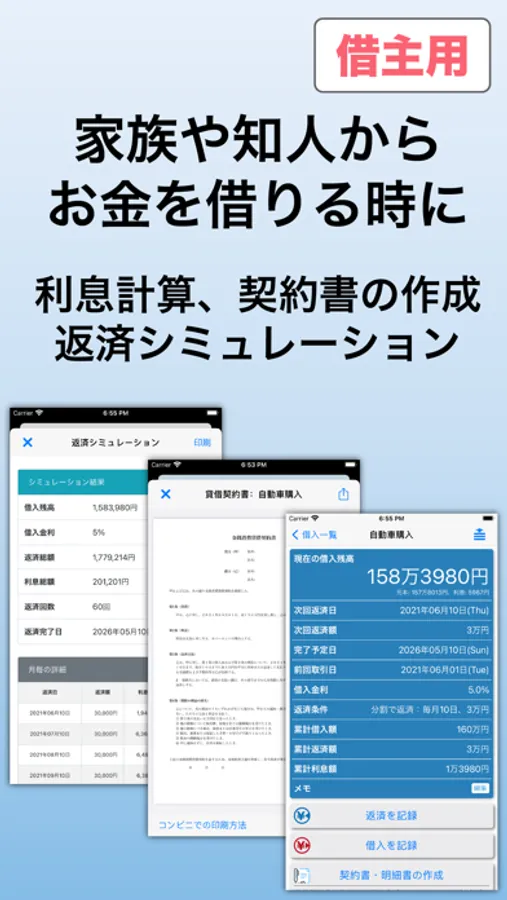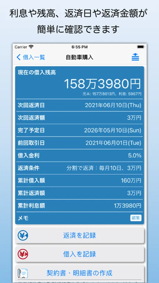お金を借りる時の利息計算や契約書作成を支援するアプリです。家族や知人間で、少し大きなお金の貸し借りを行う場合などにご利用ください。