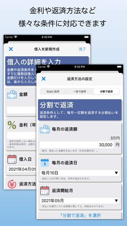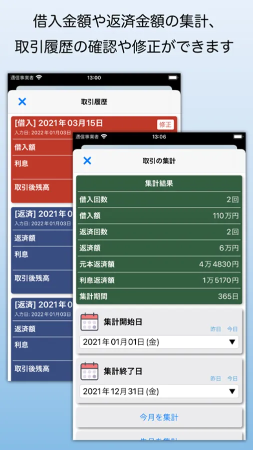 本アプリは無料でお試しいただけます。無料版では、登録可能な借入の数が1件まで、取引の数が8件までに制限されます。
