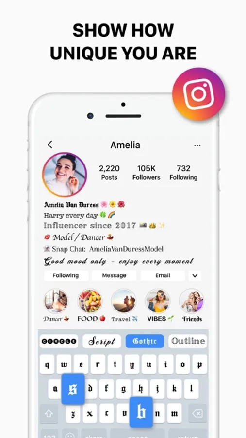 Amazing fonts that will work in ALL apps (Instagram, Whatsapp, Snapchat and more). All you need to do is open the keyboard and type!