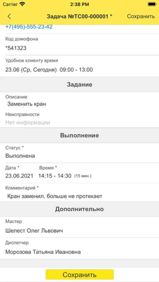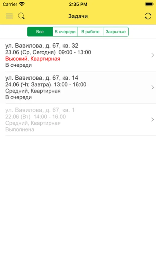 2. В приложении мастер видит список назначенных ему заявок, детальную информацию по каждой заявке и указывает результат их выполнения.