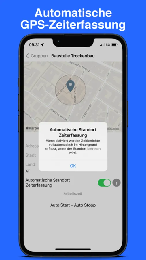 Wenn gewünscht kann die Zeiterfassung automatisch starten sobald Du dich an einem bestimmen GPS-Ort befindest.