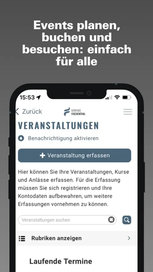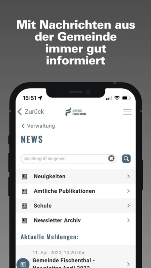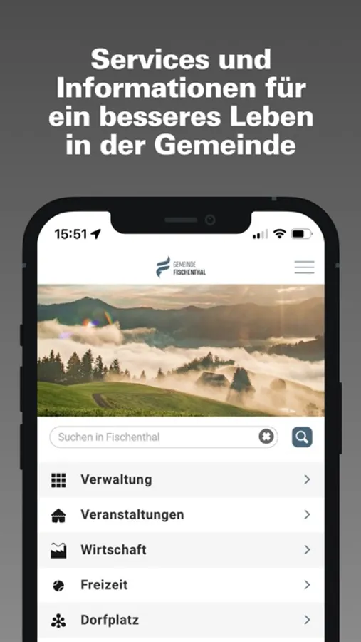 Mit der App der Gemeinde-Fischenthal bleiben Sie auf dem Laufenden: Informationen aus der Verwaltung, Veranstaltungen, Vereinen, Gewerbe, Marktplatz, Abfallsammlungen und mehr.