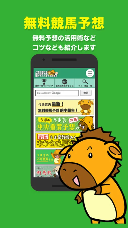 競馬予想はアプリでなくても十分!と考え、長きに渡りウェブサイトとして運営されてきた、競馬予想ではおなじみ…あの【うま吉】がいよいよアプリとして始動!競馬予想アプリはどれも似たり寄ったりな予想ばかりでつまらない…と思っている方にピッタリの競馬予想アプリになるはず!