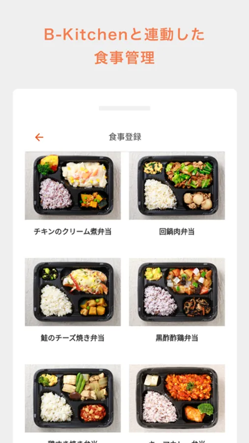 「B-Kitchen」のお弁当データと連動しているため、食べたお弁当を選ぶだけで、簡単にカロリーや栄養素を記録することができます。また、通常の食事も自分で栄養素を記録することができます。