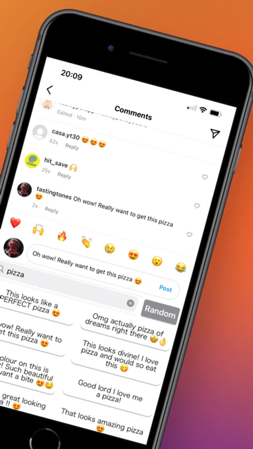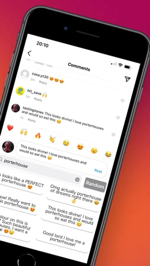 Install the FastType keyboard on your iPhone, add it to your keyboards from settings. Whenever you feel like commenting on a food post, you can simply select this keyboard and find thousands of interesting comments ready to be posted.