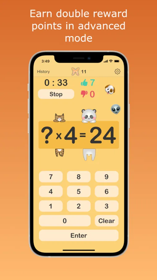 Challenge your speed of solving multiplication problems! Answer as many questions as you can to earn reward points within the countdown time. Decorate your own screen by redeeming points for stickers.