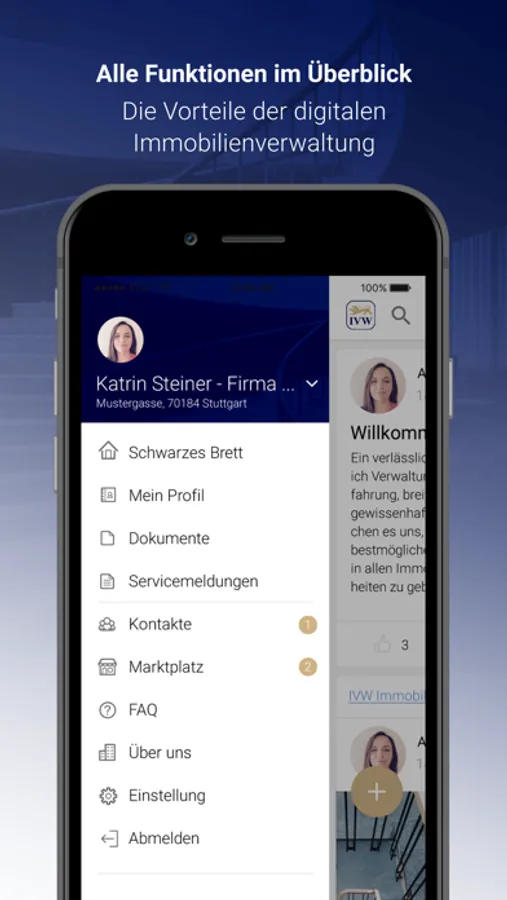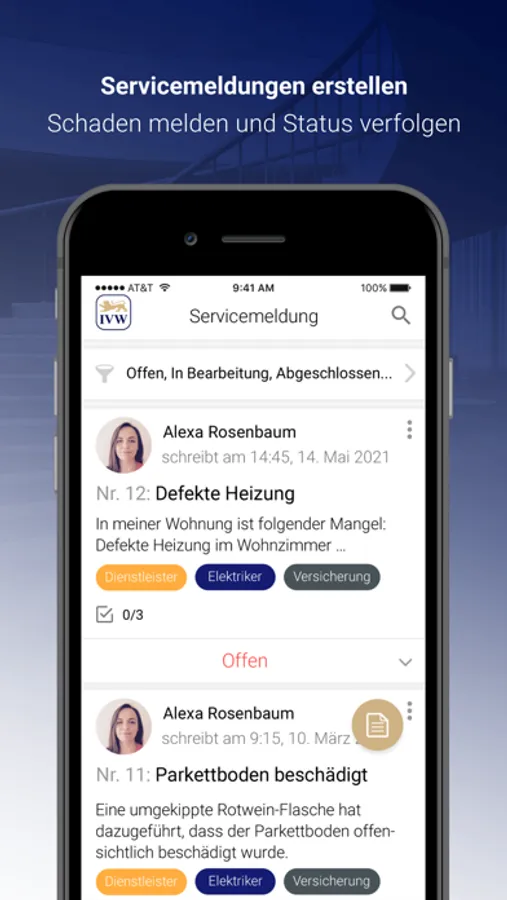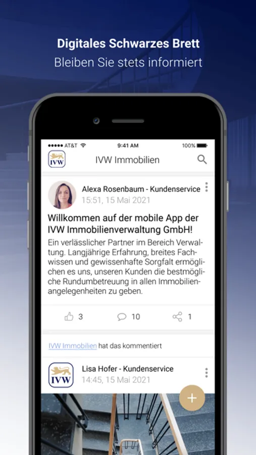 Als Kunde der IVW Immobilien Verwaltung GmbH profitieren Sie von einem besonders innovativen Kundenservice, der Ihnen viele Freiheiten bietet. Mit der IVW Immobilien App können Sie uns rund um die Uhr Anliegen und Schäden inklusive Fotodokumentation per Smartphone melden. Zusätzlich stellen wir Ihnen eine digitale Dokumentenmappe mit wichtigen Dokumenten für Ihre Immobilie(n) zur Verfügung. Über das digitale schwarze Brett informieren wir via Push-Nachricht proaktiv über wichtige Informationen rund um die uns anvertrauten Immobilien.