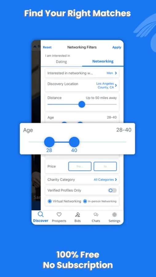 See profiles based on your filter criteria such as distance, age, keyword, charity category, only verified profiles, or more.