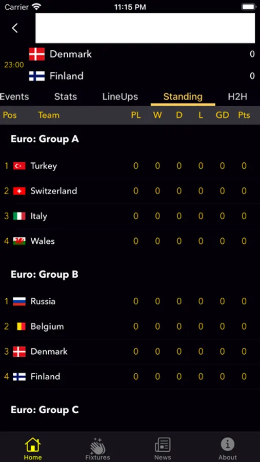 - Show detailed match information, such as stats, standings, lineup, general info, head to head and lineups