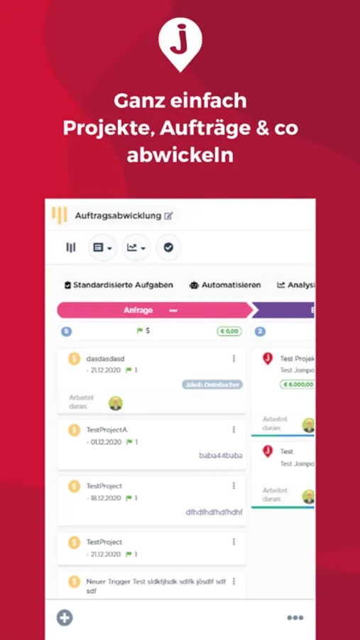 In Joinpoints kannst du mit deinen Workflows über 300 Projekte, Aufträge und co gleichzeitig managen und behältst dank der Pipeline-Ansicht stehts die Übersicht. Auch die Aufgaben-Verteilung in deinem Projekt kümmert sich Joinpoints automatisch.
