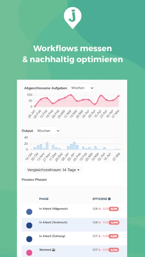 Probleme direkt an der Wurzel packen – Messe die Effizienz, die Laufzeit und viele weitere Faktoren in Echtzeit für jeden deiner Workflows. Erkenne Probleme bevor sie Auswirkungen auf deinen Unternehmenserfolg haben. Du kannst mit einem Blick überprüfen, ob Maßnahmen greifen und du wieder auf Erfolgskurs bist.