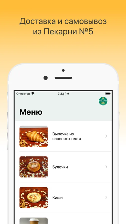 Как сделать заказ в приложении “Пекарня №5”: выберите понравившиеся позиции из меню, добавьте их в корзину и перейдите на экран оформления заказа (по нажатию на иконку корзины).