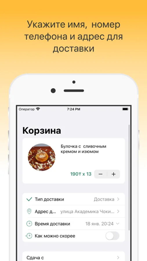 Укажите время, когда хотите прийти за своим заказом или выберите доставку с указанием времени и адреса доставки.