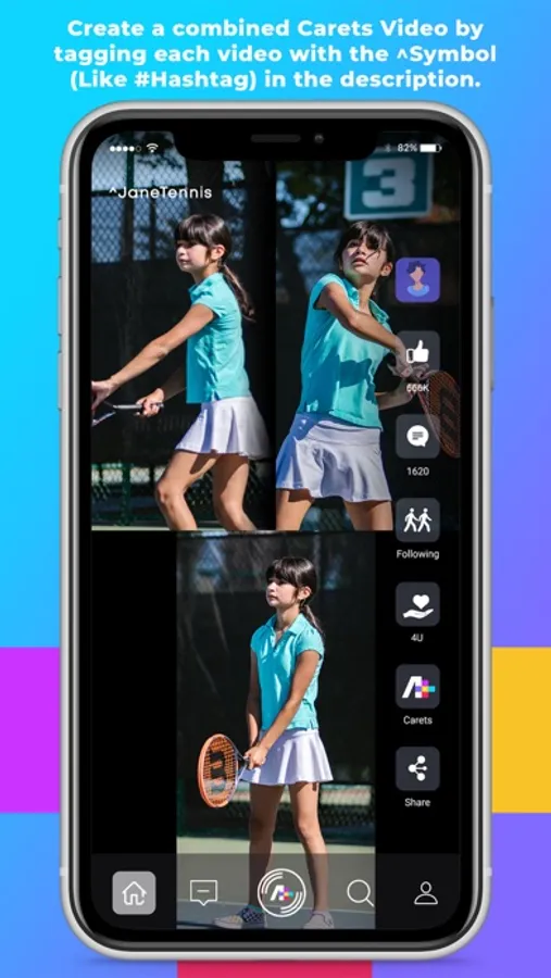 Watch video content. The app enables you to view single videos and Caret Videos that have been created by you and your fellow app users. Watch Caret Videos created by multiple users. Search by description including ^Carets, #hashtag, and @user.