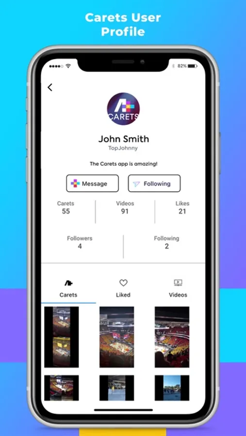 Follow other app users. You can follow individual users and easily view their individual content and Caret Videos that include their video content. You can also message these users within the app.