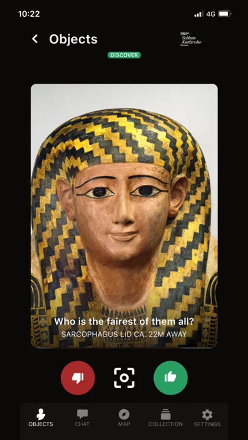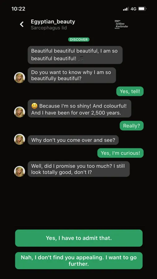 Ping! The Museum App is your companion for the playful exploration of Badisches Landesmuseum. Using the familiar Tinder mechanism, you can select objects according to your interests, chat with them and visit them in the museum. Some objects are funny, others are melancholic while others urgently need your help. How the conversations develop depends on your decisions.
