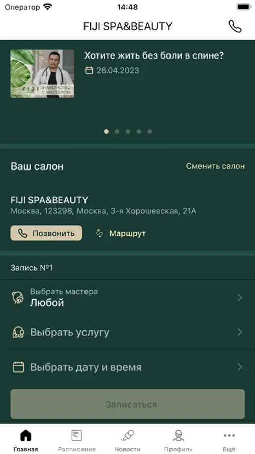 С помощью мобильного приложения FIJI SPA & BEAUTY вы можете записываться на любые услуги салона онлайн, выбирая удобное для вас время визита и подходящего мастера. В приложении встроена функция онлайн-оплаты.