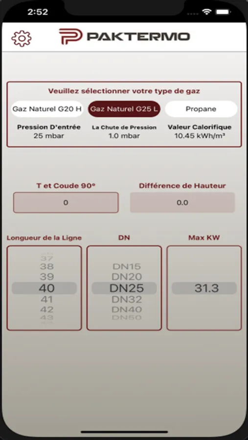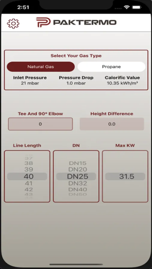 Yapmayı düşündüğünüz PAKTERMO tesisatı ile ilgili az sayıda bilgi girmenizi ister ve isabetli sonuçlar verir. Uygulamanın kullanımı oldukça kolaydır. Hattınızın uzunluğunu ve PAKTERMO hortumunuzun çapını girin, izin verilen maksimum cihaz kapasitesini KW cinsinden görün. İsterseniz propan için isterseniz de doğal gaz için hesaplama yapın.