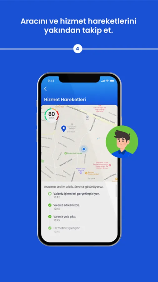 Canlı Araç Takibi: Hizmetinizi oluşturduktan sonra vale takibi ile başlayan takip sürecimiz aracınızı teslim aldıktan sonra da devam eder. “Aracım nerede? Kaç km hız ile yol alıyor? Şu an hangi işlem aşamasında?” tüm bu soruların cevabını uygulamamızda anlık olarak takip edin. Tüm hizmet sürecini en şeffaf şekilde görüntüleyin.