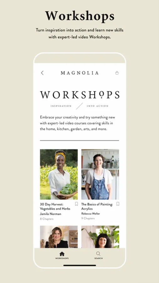 • Stream instructional video Workshops featuring some of the country’s most trusted experts for free with your Magnolia Perks account. From food and design to gardening, the arts, and more, every Workshop is designed to move at your own pace, learning as you go.