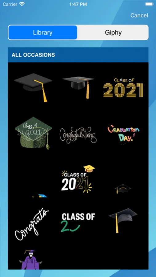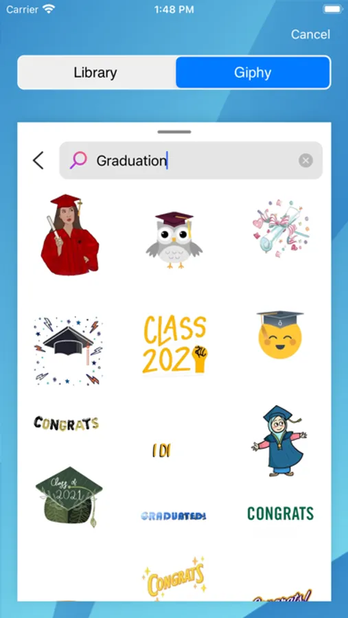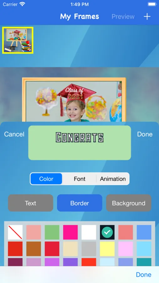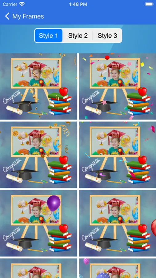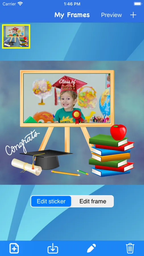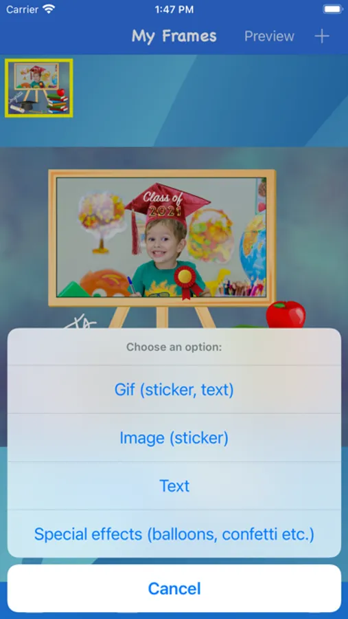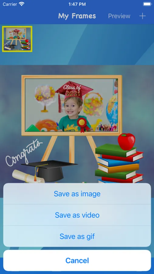Create attractive graduation/back to school frames of your child to celebrate the special occasion. Make it lively with in app provided stickers or gifs. Gifs from Giphy can be used as well. Supports animated custom text as well as special effects such as flying balloons, confetti. Save the frames as an image, video(.mp4) or gif to share on social media. Totally ad free!