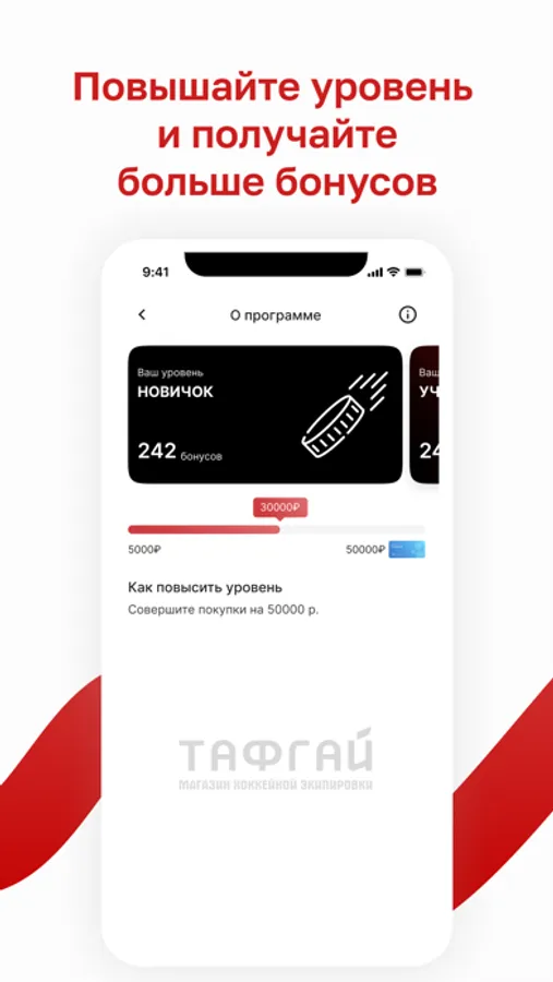 Личный кабинет магазина ТАФГАЙ в вашем смартфоне. Это приложение дает вам возможность: участвовать в программе лояльности ТАФГФАЙ, копить и тратить бонусные баллы, видеть и контролировать историю покупок, а также начисления и списания в личном счете, получать от магазина подарки в виде бонусных баллов, скидок, которые вы можете потратить на дальнейшие покупки.