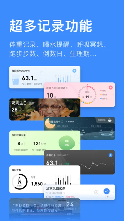 你可以用这个App实现:时间管理、日程管理、目标管理、计划管理、习惯管理、体重管理、喝水管理、生理期管理...